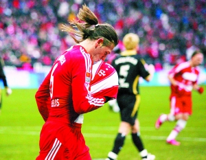 最先掀起“愛情風(fēng)暴”的是當(dāng)下狀態(tài)大勇的法國球星里貝里,他本場(chǎng)特意穿上粉紅球鞋戴上紅色手套,活脫脫一個(gè)紅色小精靈。第29分鐘他的任意球直接破門,為球隊(duì)很快扳平了比分。這也是里貝里連續(xù)第6場(chǎng)聯(lián)賽進(jìn)球,激動(dòng)的他在進(jìn)球后特別親吻了寫有妻子瓦希芭(Wahiba)名字的左手腕繃帶。半場(chǎng)結(jié)束前,中衛(wèi)德米凱利斯收獲進(jìn)球。阿根廷人進(jìn)球后令人意外地?fù)炱鹎驅(qū)⑺M(jìn)球衣里,做出孕婦的姿勢(shì)。原來這一幕是獻(xiàn)給他已經(jīng)懷孕的女友伊萬格利娜的。下半場(chǎng),拜仁的進(jìn)球風(fēng)暴并未停歇,而表達(dá)愛意的慶祝動(dòng)作也似乎可以傳染?寺鍧蓪⒗镓惱锏膫髦星蝽斎牒,伸出三根手指,指代妻子希爾維婭和雙胞胎兒子。此后托尼和奧多配合后破門,意大利人也特別親吻著左手,原來大拇指上戴有未婚妻瑪塔送他的戒指。