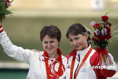 8月10日,北京奧運(yùn)會(huì)女子10米氣手槍決賽在北京射擊館落下帷幕,中國(guó)選手郭文珺以492.3環(huán)勇奪金牌,俄羅斯選手納塔利婭·帕杰林娜總分489.1環(huán)位列第二獲得銀牌,格魯吉亞老將妮諾·薩盧克瓦澤以487.4環(huán)的成績(jī)奪得銅牌。 圖為帕杰林娜(左)與薩盧克瓦澤在領(lǐng)獎(jiǎng)臺(tái)上親密合影。 ? onkeypress=