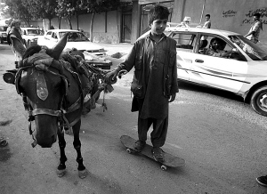 六個孩子在街頭公園里玩滑板,翻著跟頭,不停地笑著,看起來和世界任何一個城市的孩子一樣,但這里是喀布爾,阿富汗。就在離他們二十幾米以外,有輛被炸毀的汽車還躺在一攤刺眼的血跡旁,一個多小時前,這里剛剛發(fā)生了一起汽車炸彈爆炸事件。
