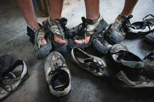 最讓大伙頭疼的還是球鞋。瓊中雨水多,球鞋很容易壞,有時兩個星期就能穿壞一雙。一開始谷教練還把隊員的鞋拿出去補,后來為了省錢索性買回工具和線讓姑娘們自己補。