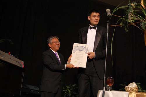 在晚宴中間,休斯頓市長比爾-懷特的代表、前市議員關(guān)振鵬講話宣布,比爾-懷特市長頒發(fā)特別文告,命名4月17日為姚明日(Yao Ming’s Day)。