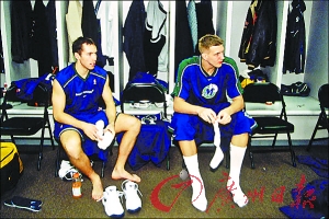 反正在賽前,你絕對見不到更衣室里人員扎堆的情況。賽場上練完投籃的人,還會跑到更衣室練點別的;在更衣室里按摩的人,弄完之后也會跑到賽場上再練會。而且,大家練習的時間也不一樣。有的人練得早,有的人出來得晚,在這樣的情況下,你要看到球員聊天說話,實在不是一件容易的事情。一般也就一兩個球員碰到一起,換衣服的時候、吃東西的時候,才會相互聊上兩句。要想在賽前采訪球員,除了等待,還得看運氣。