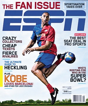 科比日前再次公開表達了自己對西甲豪門巴塞羅那的喜愛,在新一期ESPN雜志的封面上,科比身穿巴薩的紅藍球衣,擺出踢足球的姿勢。