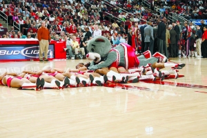 中國德比的主角自然應該是姚明和易建聯(lián)?墒腔鸺募槲锘鸺芊浅!安凰,偏要搶搶兩個東方大個子的風頭,招數(shù)就是:耍流氓!面對躺在地板上任“熊”宰割的美女們,火箭熊就差沒流口水了,一點也不憐香惜玉的把碩大的身體壓在美女們身上(上圖)。不過昨天可是火箭熊14歲大壽,天大地大壽星公最大,在自己的主場撒撒野也是無可厚非的。