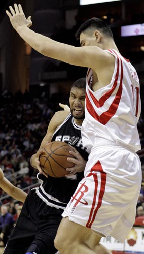 北京時(shí)間3月15日消息,在今天早上進(jìn)行的一場(chǎng)NBA常規(guī)賽中,昨天擊敗了山貓的火箭沒有能夠取得連勝。面對(duì)西南賽區(qū)的第一名圣安東尼奧馬刺,姚明拿到了18分11個(gè)籃板球,鄧肯拿到了15分12個(gè)籃板。火箭最后關(guān)頭連續(xù)錯(cuò)失反超和扳平拖入加時(shí)的機(jī)會(huì),最終以85比88遺憾的輸給了馬刺。