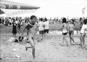 在網(wǎng)絡(luò)上,一張名為“火箭勝湖人,深圳球迷被迫裸奔”的貼圖瘋傳。發(fā)帖者稱,此深圳球迷王×,乃湖人當(dāng)家球星科比的粉絲,之前在網(wǎng)上揚(yáng)言火箭勝湖人他就裸奔,不幸言中,被網(wǎng)友們?nèi)巳馑阉,要求他兌現(xiàn)承諾。發(fā)帖者甚至稱要求王×裸奔的還有其女友,因女友乃不折不扣的火箭球迷。王×在重重壓力之下遂面對現(xiàn)實(shí),兌現(xiàn)承諾。于是5月5日下午的大梅沙海濱沙灘上,出現(xiàn)這樣一幕場景:一名男子脖套花內(nèi)褲,手捂下體,向大海奔去,臉帶幾分笑意,幾分羞澀。