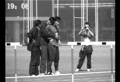 跨完一組欄后,劉翔站在跑道邊,叉著腰休息。這時(shí),一名站在一旁、身穿黑色T恤、身背帶有參賽號(hào)碼布背包的男運(yùn)動(dòng)員突然走到劉翔身后,從身后將劉翔雙手抱住。隨后的舉動(dòng)更加雷人,該男子居然做出一副小鳥依人的模樣,還將頭靠在劉翔的肩頭。一邊陶醉地抱著,該男子還一邊在劉翔耳邊耳語了兩句。