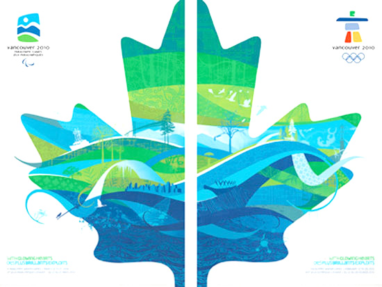 冬奧會和冬季殘奧會海報(bào)的主體都是半片楓葉,不同的是前者楓葉靠左,右上角是2010年冬奧會會徽;后者靠右,左上角為2010年冬季殘奧會會徽。兩者拼接在一起,則構(gòu)成一片完整的楓葉。與傳統(tǒng)上象征加舀大的紅色楓葉不同的是,這兩張海報(bào)上的楓葉顏色是藍(lán)鸀白相間,代表著溫哥華冬天的顏色--藍(lán)天、大海和雪山。楓葉上充滿動感的、不同形狀的線條,以及冰球、花樣滑冰和高山滑雪等項(xiàng)目的插圖則傳達(dá)著冬奧會的元素。