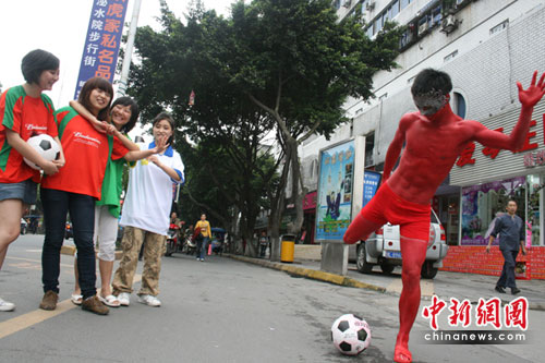 18時(shí)許,一位頭戴面具,滿身紅色的“怪人”突然現(xiàn)身樂(lè)山城區(qū)街頭,身邊還有幾位足球?qū)氊惛S,這一幕引來(lái)了不少行人駐足觀看!皨寢,快看,那人全身都是紅的,好奇怪哦!”一位母親帶著孩子路過(guò),一個(gè)“怪人”的出現(xiàn),讓孩子發(fā)出尖叫聲。只見“怪人”滿身涂滿紅色顏料,頭戴面具,手里還抱著一個(gè)足球!肮秩恕蓖O潞,拿著足球擺起各種踢球的姿勢(shì),不少路人見此情景,立即停下腳步,紛紛圍觀,甚至還有人掏出手機(jī)拍照。