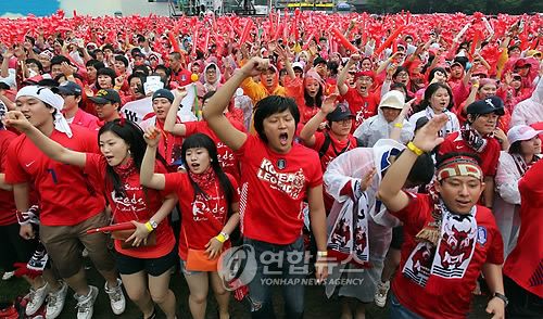 在韓國國內(nèi),熱情的韓國球迷也早早走上街頭,準(zhǔn)備為太極虎助威。警方稱,全國街頭助威地點(diǎn)共有280多處,預(yù)計會有178.6550萬名球迷為遠(yuǎn)征南非的太極虎助威。在首爾市,規(guī)模最大的助威場地要數(shù)首爾廣場,預(yù)計會云集25萬名球迷。盡管今天該國普降大雨,廣場卻已站滿了人,甚至有熱心球迷早上7點(diǎn)就來占位。
