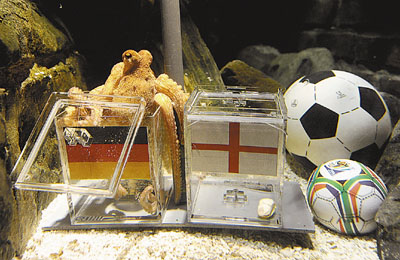 這只名為保羅的兩歲大章魚恰巧生于英國,在德國長大。海洋館員把分別印有德、英旗幟的貝殼放入玻璃缸,結(jié)果保羅只取出德國那枚貝殼。保羅之前也曾“估中”德國勝澳洲、加納與輸給塞爾維亞的賽果,德國隊(duì)在上屆歐國杯的賽事,其預(yù)測命中率也有8成。
