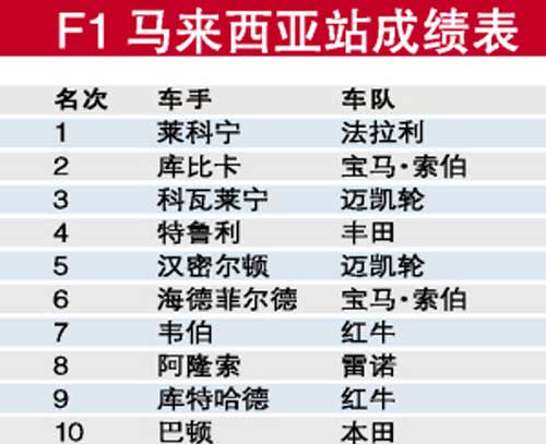 昨天下午,世界一級(jí)方程式錦標(biāo)賽馬來(lái)西亞大獎(jiǎng)賽結(jié)束。法拉利車隊(duì)芬蘭車手萊科寧優(yōu)勢(shì)明顯輕取冠軍,來(lái)自波蘭的寶馬車手庫(kù)比卡和另一位芬蘭人邁凱輪車手科瓦萊寧分獲亞軍和季軍。上站比賽獲勝的邁凱輪車隊(duì)英國(guó)車手漢密爾頓位居第五。本站桿位得主法拉利巴西車手馬薩退賽。本站賽后,積14分的漢密爾頓仍然領(lǐng)先車手積分榜。邁凱輪積24分繼續(xù)領(lǐng)跑車隊(duì)積分榜。