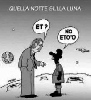 漫畫的標(biāo)題是“Quella Notte Sulla Luna(月球上的那一晚)”,借著“人類登月40周年”的名頭來調(diào)侃一下意甲的轉(zhuǎn)會。月球的環(huán)形山之間,站著兩個(gè)卡通人物,左邊身穿藍(lán)色西裝的老頭,是國際米蘭主席莫拉蒂,右邊身穿紅藍(lán)色巴薩球衣的黑人,是喀麥隆前鋒埃托奧。