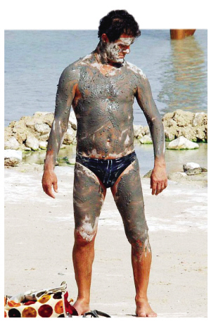 意大利南部小城大多有水溫從32到37攝氏度不等的溫泉,這些景點專門提供一些泥浴治療服務(wù)。來這里享受休閑的卡佩羅及其妻子就這樣一不小心落入了記者的鏡頭。與比賽場邊的威嚴(yán)姿態(tài)大相徑庭,鏡頭前只穿了一條黑色泳褲的卡佩羅從頭到腳、甚至包括臉部都涂滿了深灰色的泥漿,要不是那一頭標(biāo)志性的卷發(fā),意大利人的身份還真有些難以“識別”。身邊的勞拉更將泥漿涂抹得辨別不出了比基尼的花色。低頭看看自己身上的“作品”還算令人滿意,63歲的卡佩羅于是走到勞拉身邊,和自己的老婆開起了玩笑。