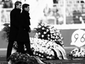 隨著德國(guó)隊(duì)隊(duì)長(zhǎng)巴拉克和默特薩克將一個(gè)花圈放在了恩克靈柩前,哀悼?jī)x式正式開(kāi)始,天主教神父普羅辛格致詞,“羅伯特·恩克不僅僅是一位偶像,對(duì)許多人來(lái)說(shuō),他也是一位理想的楷模!睗h諾威96俱樂(lè)部主席金德作為第二位致詞人出場(chǎng),“羅伯特·恩克不會(huì)再回到這個(gè)球場(chǎng)了,我們的心情非常沉重!
