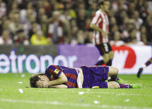 不過(guò)最讓巴薩不爽的還不是無(wú)奈將榜首席位讓給死敵皇馬,而是該隊(duì)頭牌梅西在比賽中兩度受傷。先是在第20分鐘,梅西在爭(zhēng)搶時(shí),被對(duì)方身高1米92的中衛(wèi)埃莫雷維埃抬腳亮出的鞋釘狠狠踩中右臉部,顯然埃莫雷維埃抬腳過(guò)高就是故意沖著梅西去的。梅西當(dāng)即痛苦地捂臉倒地,隊(duì)醫(yī)立即進(jìn)場(chǎng)緊急處理,好一會(huì)梅西才起身,但靠近右眼的部分已經(jīng)被鞋釘劃出了一道很深的血口。但梅西還是堅(jiān)持比賽,因此盡管梅西此戰(zhàn)沒(méi)能進(jìn)球幫助巴薩取勝,但賽后梅西帶傷作戰(zhàn)的精神卻贏得了媒體的一致贊揚(yáng)。但在第76分鐘,梅西因肌肉拉傷還是提前被博揚(yáng)換下。據(jù)悉,梅西賽后檢查的結(jié)果是傷勢(shì)很重,極可能將缺席本周在歐冠、西甲中與國(guó)米、皇馬的兩場(chǎng)關(guān)鍵戰(zhàn)役。