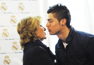 北京時(shí)間昨天是C羅的生日,他和皇馬主席弗洛倫蒂諾一起在伯納烏參加了一項(xiàng)新聞發(fā)布會(huì)。皇馬俱樂(lè)部與馬德里大區(qū)達(dá)成了合作協(xié)議,皇馬基金會(huì)將會(huì)投資幫助馬德里大區(qū)那些未成年人、外國(guó)移民等等。在新聞發(fā)布會(huì)現(xiàn)場(chǎng),C羅和弗洛倫蒂諾開(kāi)起了玩笑;蜀R主席問(wèn)C羅“你現(xiàn)在多大了”,C羅回答“我20歲了”。弗洛倫蒂諾當(dāng)即揭穿了C羅的謊言:“你已經(jīng)25歲了,你竟然已經(jīng)這么老了!”當(dāng)然,這次玩笑以全場(chǎng)歡笑告終!∽鳛榛蜀R代表,C羅還與馬德里大區(qū)女主席阿吉雷進(jìn)行了親密接觸。盡管阿吉雷的年齡足以當(dāng)C羅的奶奶,但葡萄牙人還是跟她來(lái)了一個(gè)貼面熱吻。在被C羅熱吻之后,阿吉雷顯得非常高興,立刻說(shuō):“C羅是世界上最出色的球員,沒(méi)有之一!蓖瑫r(shí)阿吉雷也宣稱(chēng),“皇馬是歷史上最出色的足球俱樂(lè)部。”