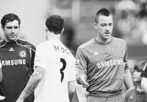看臺上雙方球迷打出了支持各自球員的橫幅,與“特里之隊”相對的是“布里奇之隊”。開場后,布里奇和特里有過一次直接面對面的機(jī)會。特里在大禁區(qū)左側(cè)拿球,布里奇在防守他,雙方并沒有糾纏太久,特里草草射了一腳門了事。