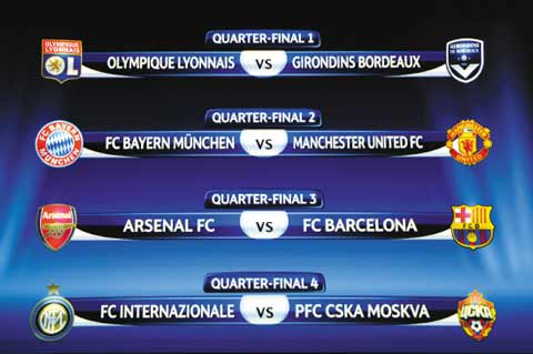 歐冠1/4決賽和半決賽對(duì)陣形勢(shì)昨晚在瑞士尼翁揭曉,上半?yún)^(qū)是拜仁慕尼黑對(duì)曼聯(lián)、里昂對(duì)波爾多,下半?yún)^(qū)是阿森納對(duì)巴塞羅那、國(guó)際米蘭對(duì)莫斯科中央陸軍,“重逢”成為本次抽簽的主題。由英超球隊(duì)包辦半決賽3個(gè)席位的乏味場(chǎng)面本賽季絕不會(huì)出現(xiàn)了,本賽季8強(qiáng)來(lái)自6個(gè)國(guó)家的聯(lián)賽。
