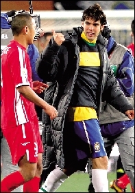 賽前大屏幕用視頻方式公布各隊(duì)首發(fā)名單,卡卡出現(xiàn)時,引發(fā)了全場最響亮掌聲和尖叫聲。當(dāng)卡卡踏上球場,球迷的呼喊聲也是最大的。但比賽中的卡卡讓球迷失望了?ǹ看文们蛏磉吙倳3名球員包夾。帶球被搶斷、傳球不到位、多次被撞翻,甚至帶球急停時摔跤。很顯然,卡卡的身體狀態(tài)非常糟糕。第80分鐘,卡卡被換下。賽后,心煩的卡卡甚至拒絕了鄭大世交換球衣的要求。
