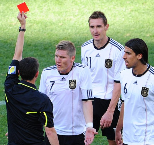 在上半場,德國隊還占據(jù)場上的主動。不過克洛澤在第12分鐘就吃到一張黃牌,而其隊友也不斷被西班牙隊出示黃牌。第37分鐘,克洛澤在防守斯坦科維奇時,先鏟倒了球,這是一個可判可不判的犯規(guī),一般的裁判只會給個口頭警告。結(jié)果主裁判烏迪亞諾竟在未口頭警告的情況下,直接就出示第二張黃牌將其罰下。