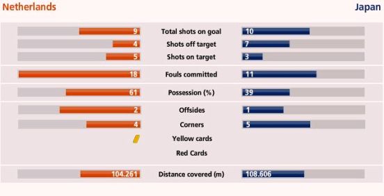 荷蘭隊(duì)全場(chǎng)比賽有9腳射門,5次射中門框范圍內(nèi),其中包括一個(gè)進(jìn)球和兩次被日本隊(duì)門將川島永嗣化解的必進(jìn)球機(jī)會(huì)。日本隊(duì)有10腳射門,3腳射中門框范圍,其中最后階段的一次射門險(xiǎn)些將比分追平。日本隊(duì)的角球同樣多于荷蘭隊(duì),5次角球,比荷蘭隊(duì)多了一個(gè)。