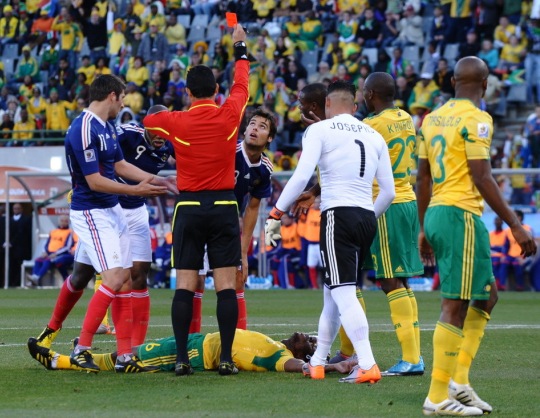 也許失球只是法國(guó)隊(duì)噩夢(mèng)的開始,比賽進(jìn)行到第25分鐘,法國(guó)隊(duì)攻入南非隊(duì)禁區(qū),中場(chǎng)球員、有著“齊達(dá)內(nèi)接班人”之稱的古爾庫夫在爭(zhēng)頂頭球時(shí)肘部擊中了對(duì)手,南非隊(duì)隊(duì)員就勢(shì)倒地不起做昏厥狀。主裁判果斷出示紅牌,將古爾庫夫罰下。
