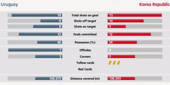 韓國隊(duì)在場上更加咄咄逼人,他們的犯規(guī)次數(shù)和烏拉圭隊(duì)都是12次,但是韓國隊(duì)因?yàn)榍址笇κ殖缘饺龔堻S牌。烏拉圭隊(duì)有一次越位,兩隊(duì)的角球都是3個,旗鼓相當(dāng)。
