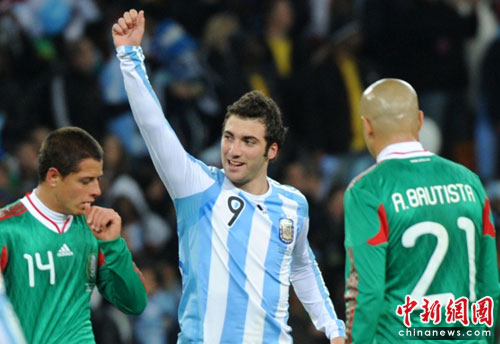 中新網(wǎng)6月28日電 今天凌晨2:30,南非世界杯1/8決賽再賽一場,阿根廷隊(duì)在約翰內(nèi)斯堡的足球城球場迎來了墨西哥隊(duì)。憑借特維斯一個(gè)明顯越位進(jìn)球首開紀(jì)錄,隨后伊瓜因和特維斯各進(jìn)一球,以3-1擊敗墨西哥,晉級(jí)八強(qiáng)。