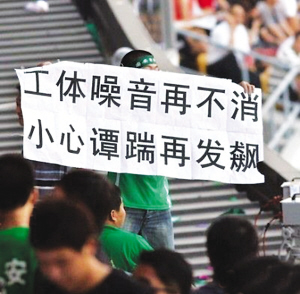 昨晚7點(diǎn)30分,2009賽季中超第14輪比賽全面打響,北京國(guó)安隊(duì)主場(chǎng)迎戰(zhàn)大連實(shí)德隊(duì)。盡管昨天并不是周末,但北京工人體育場(chǎng)上座率依然很高,球迷們打出了各種個(gè)性十足的標(biāo)語(yǔ),如“工體噪音再不消 小心譚踹再發(fā)飆”,還有球迷身著“國(guó)安,跟丫死磕”的T恤衫到場(chǎng)為北京國(guó)安隊(duì)加油助威。另外,大連藍(lán)色激浪球迷也組織了聲勢(shì)浩大的助威團(tuán),專(zhuān)程從大連趕到北京為自己的球隊(duì)加油助威。