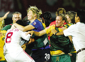 人在足球場(chǎng),女子也瘋狂!8月3日晚上的武漢漢口體育場(chǎng),在亞青賽中國(guó)隊(duì)與澳大利亞隊(duì)的比賽結(jié)束之后,溫文爾雅的女孩們也動(dòng)起了老拳,場(chǎng)上三四十人亂戰(zhàn)成一團(tuán),經(jīng)過(guò)亞足聯(lián)官員長(zhǎng)達(dá)十分鐘的調(diào)解,事態(tài)才暫時(shí)得到平息。然而,心懷不滿(mǎn)的澳大利亞女足姑娘們,還意猶未盡,在回到更衣室后,她們瘋狂地拆卸了更衣室的衣柜,砸成一團(tuán)。而她們的教練也按捺不住心中的憤懣,在發(fā)布會(huì)上當(dāng)著眾多記者面,砸掉了手中的礦泉水瓶,險(xiǎn)些砸到一名中國(guó)記者。一場(chǎng)普通的比賽,以這樣的方式收?qǐng)觯磥?lái),足球之亂,并非只在中國(guó)球員身上,也并非只是成年隊(duì)球員。
