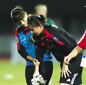 中澳比賽進(jìn)行到下半時(shí)后半段,屈珊珊后場(chǎng)開(kāi)球拖延時(shí)間被黃牌警告。傷停補(bǔ)時(shí)階段,門(mén)將張?jiān)匠鰮羰軅蟮沟夭⒔邮荜?duì)醫(yī)進(jìn)場(chǎng)治療,此時(shí)澳大利亞球員杰西卡卻認(rèn)為中國(guó)隊(duì)隊(duì)醫(yī)故意拖延比賽時(shí)間,與中國(guó)隊(duì)員發(fā)生肢體沖突。印度主裁判本迪卡在與韓國(guó)助理裁判商量后,將澳大利亞隊(duì)杰西卡紅牌罰下,這引起了澳大利亞主教練的大大不滿(mǎn)。