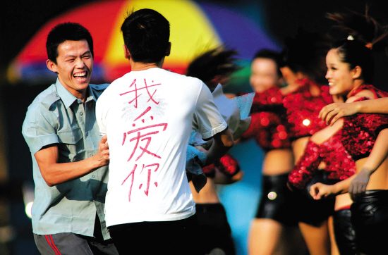 “我愛(ài)你……!”昨天下午,廣州越秀山體育場(chǎng)正在舉行中超足球賽,中場(chǎng)休息時(shí),一群紅衣足球?qū)氊惖菆?chǎng)激情表演,突然,一名身著“我愛(ài)你”衣服的男子,手持鮮花沖進(jìn)球場(chǎng),寶貝們當(dāng)場(chǎng)“四處逃散”。隨后該男子被保安拖出場(chǎng)……頓時(shí)四周響起一片喧囂聲。 本報(bào)記者 鄭迅 攝影報(bào)道