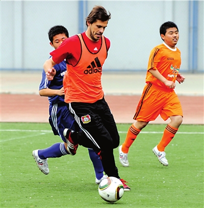 由于球員傷病或去國家隊備戰(zhàn)世界杯,勒沃庫森隊中阿德勒、克羅斯和基斯林等無法來華,不過前德國國腳M·弗里德里希以及辛基維奇、卡斯特羅和黑爾默斯等明星球員均隨隊前來,全隊最大牌的還是德國前國家隊主教練沃勒爾。昨天下午,弗雷德里希等球員來到回民中學(xué),在球場上對學(xué)校小球員們進行了技術(shù)指導(dǎo)。