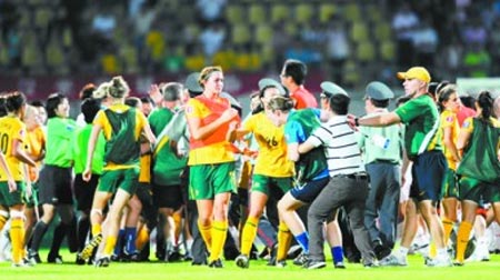 8月3日晚,中國青年女足在武漢2∶1險勝澳大利亞隊,亞青賽兩連勝提前小組出線,但在比賽結束后,雙方發(fā)生沖突,一名澳大利亞球員將中國球員張越打倒,雙方替補球員和教練見狀全部沖到場內(nèi),一片混亂之后,經(jīng)過亞足聯(lián)官員的親自協(xié)調(diào),事件才平息。據(jù)了解,澳球員之所以“發(fā)飆”,是覺得輸?shù)煤堋案C囊”,覺得“中國隊做了裁判工作”。路透社的報道說“這起事件無疑對中國足球的聲譽又是一次打擊。 ”但事實上,算上上周日中超聯(lián)賽重慶隊主教練阿里·哈恩的“瘋狂咆哮”,連續(xù)兩次都是外國教練和外國球員在中國綠茵撒野,這里必須要問一句:憑什么?