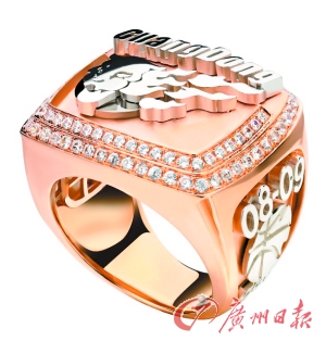據(jù)鉆戒設計人員透露,為使設計更加新穎,在材質(zhì)的挑選上采用了正逐漸成為全球珠寶市場主流的18K玫瑰金,每枚重達40克,頂部鐫刻著廣東隊的隊標,環(huán)繞以79粒晶瑩的高品質(zhì)鉆石;戒指的右側面鐫刻著“08-09”的字樣和CBA籃球面孔的標志,左側是球員姓名及球衣號碼;指環(huán)下方用鐳射技術刻有“戴夢得”的字樣。整個戒指通體造型渾厚穩(wěn)重,溢彩流光,充分表現(xiàn)出冠軍球隊的王者之氣。戒指上的信息全部采用工藝復雜的分件倒模技術,呈現(xiàn)凸字效果,增加戒指立體感及時尚感。