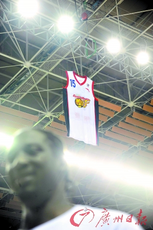儀式開始前,積臣和宏遠(yuǎn)集團(tuán)公司董事長一起拉下了遮簾,他的15號球衣在東莞體育館上空高高掛起,這是5冠王俱樂部第一件退役的球衣。