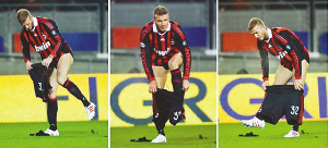 不知是不是太過賣力,動(dòng)作幅度太大,貝克漢姆的球褲在比賽中竟然撕裂了。向裁判申請(qǐng)后,米蘭隊(duì)工作人員將新球褲遞了上來,場(chǎng)上的萬人迷直接站在草地上,一把扯下身上的球褲,扔在地上,再將新球褲穿了上去。整個(gè)動(dòng)作連貫流暢,沒有一絲猶豫,不過在他彎腰的時(shí)候,全場(chǎng)觀眾仍然看到了他的黑色緊身內(nèi)褲下屁股的線條,這遠(yuǎn)遠(yuǎn)比貝克漢姆的腳法更容易讓女球迷激動(dòng)。