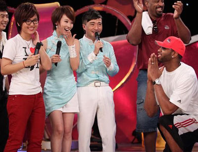 這不,在他結(jié)束中國行之前,安徽衛(wèi)視的一檔綜藝節(jié)目邀請麥迪和前超級女聲亞軍周筆暢一同參加節(jié)目,讓現(xiàn)場的觀眾大呼過癮。在節(jié)目現(xiàn)場,當(dāng)?shù)弥矍斑@個(gè)較小的女孩竟然是中國的一位頗具實(shí)力的歌唱新星時(shí),麥迪想盡一切辦法希望能聽到周筆暢的歌聲,包括表演了各種籃球技巧。當(dāng)然,為了回饋麥迪,周筆暢當(dāng)場獻(xiàn)上一曲《I Believe I Can Fly》。對于美國球員來說,這首歌是再熟悉不過的了,因?yàn)樗鼛缀跏菫榛@球飛人邁克爾·喬丹量身定制的。麥迪十分欣賞周筆暢的歌聲,而且一邊聽還一邊不停揮舞雙手,連連稱贊道:“她有一副好嗓子,我祝福她今后可以發(fā)展得更好!” 之后,與麥迪同行的友人更是抱起周筆暢的腰將她托起來灌籃。這一舉動讓周筆暢大感意外,對著歌迷說:“這可是我人生第一個(gè)大灌籃!” 。