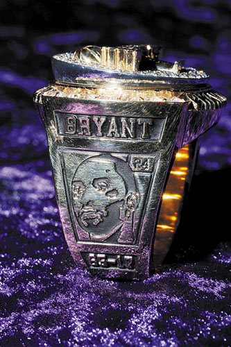以前的總冠軍戒指都要分別刻上不同球員的名字和號碼,新版湖人總冠軍戒指又作出創(chuàng)新,增加了球員頭像。每一枚總冠軍戒指又會(huì)選出一顆鉆石刻上湖人的“L”字母,不同戒指的這些“L”所處鉆石的位置又會(huì)不同,必須通過高倍顯微鏡才能看到,因此每人的總冠軍戒指都是自己獨(dú)一無二的身份證明。