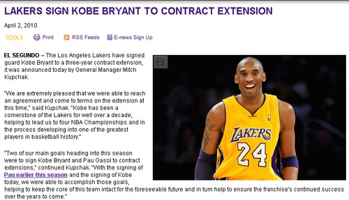 中新網4月3日電 當?shù)貢r間4月2日,NBA洛杉磯湖人隊在其官方網站上宣布:已與隊中頭號球星科比正式續(xù)約三年。