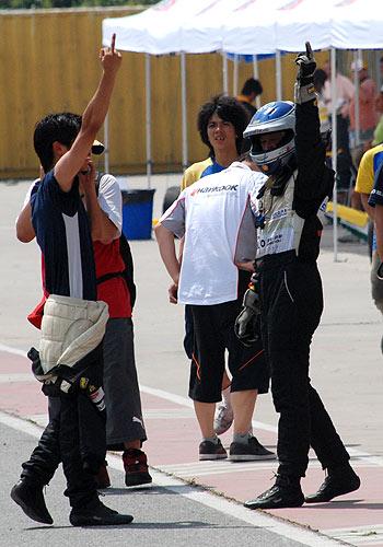 在事故發(fā)生后,韓寒鉆出已經(jīng)面目全非的賽車,用盡全力狠狠地摔了下車門,然后走下賽道。掙扎著駛回賽道的王睿,也在幾圈后遭遇裁判黑旗而退出比賽。當(dāng)王睿將車開會(huì)維修區(qū)時(shí),已經(jīng)脫下一半賽服的韓寒,一邊打電話,一邊上前安慰王睿。隨后,兩人非常默契地同時(shí)伸出中指,高高地指向天,并各自轉(zhuǎn)了360度,以便讓現(xiàn)場(chǎng)的更多觀眾和記者看到。此舉立刻引起軒然大波。
