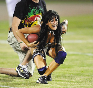 2009年,美國女子內(nèi)衣橄欖球大聯(lián)盟(簡稱LFL)正式誕生,聯(lián)盟由10支球隊組成,球隊選拔隊員時不求最壯只求最靚,球員是清一色的性感美女。一群身材火爆的辣妹,穿著讓人“流鼻血”的性感內(nèi)衣在場上肉搏美式足球,讓人大飽眼福的運動今年9月4日開打,頂著金融危機的風(fēng)險,這項停辦兩年的比賽終于得以再度舉行。