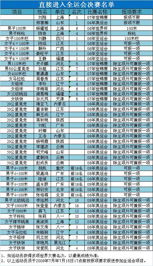 7月10日,中國田徑協(xié)會公布了直接進入全運會決賽的田徑運動員名單。劉翔、邢慧娜、黃瀟瀟、周春秀等45名選手列入名單。入選名單的運動員還必須在2009年7月15日17時前,按報名項目要求報送參加全運會比賽的報名申請。