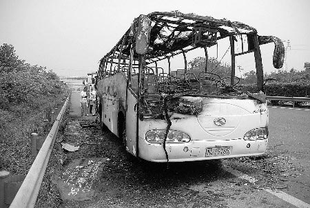 “當時火勢確實比較猛烈。”成都消防六中隊的消防隊員說,上午10時許接到報警后隨即趕到現場,整個客車幾乎被火包圍,30多名乘客站在據事發(fā)地200多米遠的路邊,焦急地看著燃燒的客車卻無可奈何。消防隊員立即架起高壓水槍對著起火的客車掃射,不到5分鐘,火勢控制下來了。