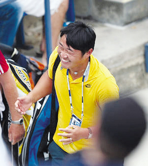 兩盤比賽,李娜沒有給對(duì)手任何機(jī)會(huì),丈夫姜山在場下的表情逐漸變得豐富起來,不再是往常那樣的面無表情或者是淺淺的微笑,從他的臉上能看出明顯的情緒變化,滿臉的笑容能夠讓所有人感受到他的興奮。第二盤在自己的發(fā)球局里,李娜連得三分拿到三個(gè)賽點(diǎn),并且在第一個(gè)賽點(diǎn)出現(xiàn)時(shí)就拿下比賽。李娜在賽場內(nèi)蹦了起來,姜山和托馬斯在場外也是一陣狂喜,姜山的眼睛瞇成了一條縫,嘴也快咧到耳根。跟往常一樣,姜山和托馬斯在比賽結(jié)束之后就背著球包離開。他和托馬斯一邊走一邊聊天,不斷有球迷從他們倆中間穿過,這絲毫沒有影響兩人的好心情,他們很興奮地一邊聊天一邊比劃著。姜山伸出食指指向天空,難道是已經(jīng)將目標(biāo)瞄準(zhǔn)了第一嗎?