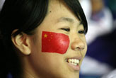 亞運(yùn)會(huì)舉重賽場(chǎng)的看臺(tái)上,孩子們臉上貼著亞運(yùn)標(biāo)志觀看比賽。