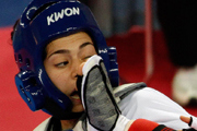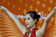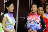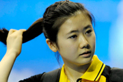 臺球女子美式8球單打亞軍、韓國選手金佳映,參加頒獎儀式前,饒有興致地向禮儀小姐學(xué)習(xí)儀態(tài)。
