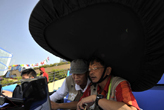 18日上午,亞運(yùn)會龍舟項(xiàng)目在增城開賽,戶外工作的攝影記者頭戴巨型帽子遮陽,以便更好的工作。