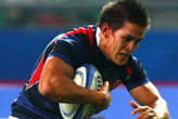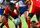 23日,橄欖球男子組決賽中,中國香港隊(藍)以21:28不敵日本隊,獲銀牌。圖為激烈火爆的賽場瞬間。